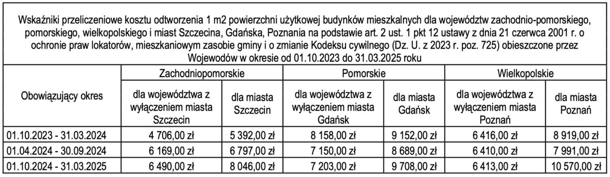 Dwa razy w roku, w miesiącach marzec i wrzesień, każdy Wojewoda ustala wysokości wskaźników przeliczeniowych kosztu odtworzenia 1 m² powierzchni użytkowej budynków mieszkalnych dla danego województwa i miasta wojewódzkiego na podstawie art. 2 ust. 1 pkt 12 ustawy z dnia 21 czerwca 2001 r. o ochronie praw lokatorów, mieszkaniowym zasobie gminy i o zmianie Kodeksu cywilnego (Dz. U. z 2023 r. poz. 725) w obowiązujących okresach od 01 kwietnia do 30 września oraz od 01 października do 31 marca.