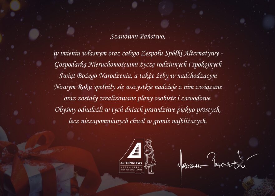 w imieniu własnym oraz całego Zespołu Spółki Alternatywy – Gospodarka Nieruchomościami życzę rodzinnych i spokojnych Świąt Bożego Narodzenia, a także żeby w nadchodzącym Nowym Roku spełniły się wszystkie nadzieje z nim związane oraz zostały zrealizowane plany osobiste i zawodowe.